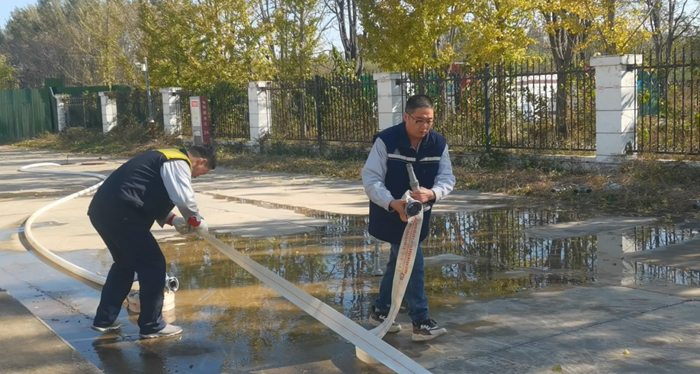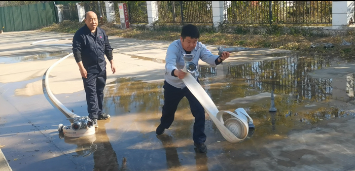 同時,華騰化工還專門組織了消火栓實操。“先接水帶、再開閥門、最后對準目標出水!”在安全員的指導下,員工兩人一組協作,快速完成水帶連接、水槍連接等步驟,水柱精準噴射至指定區(qū)域,整個過程有條不紊。
